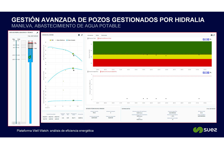 Well Watch is a technological tool promoted by the Suez group that allows real-time control of the catchment conditions. With it, some key parameters are monitored to observe their proper functioning, such as the indicators of the quantity and quality of the aquifers, the specific flow rate of the wells, the ratios of the pumping equipment (in kWh/m3 and in Wh/m3/m) and real-time operating parameters including water level depth, instantaneous pumping rate, energy consumption, and wellhead pressure.