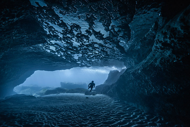 ‘Underwater caves’, imagen que capta en tonos azulados la imagen de un buceador en una cavidad submarina de Menorca, dio el triunfo al menorquín, Víctor de Valles Ibáñez, la pasada edición de PhotoAquae. En 2019 el ganador fue Andrés Carrasco, de Algeciras (Cádiz), con su fotografía en blanco y negro ‘Disfrutando del agua’, que muestra a un niño de Cabo Verde regándose con agua de un bidón.