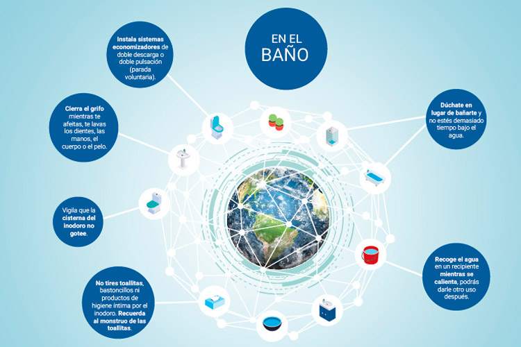 Estos mensajes directos están acompañados por una serie de consejos concretos para ahorrar agua que se dividen en diferentes estancias y situaciones habituales del día a día. Así, en la cocina se recogen recomendaciones como cerrar el grifo mientras se enjabona los platos, poner el lavavajillas cuando esté en plena carga o enjuagar la fruta en un recipiente.